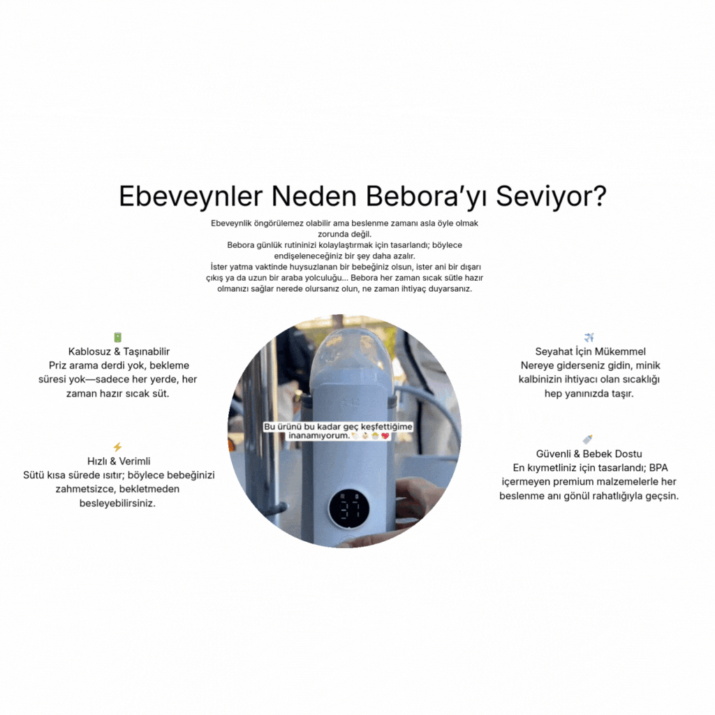Bebeğinizi besleme zamanı nerede olursanız olun hızlı, kolay ve stressiz olmalı.Evde, yolda veya dışarıda işlerinizi hallederken…Bebora , bebeğinizin sütünü birkaç dakika içinde ısıtır—kablo yok, bekleme yok, zahmet yok.